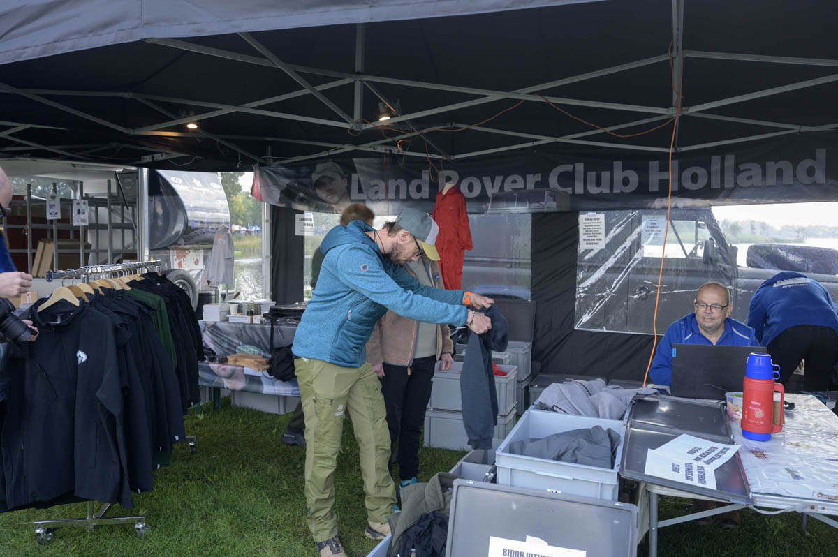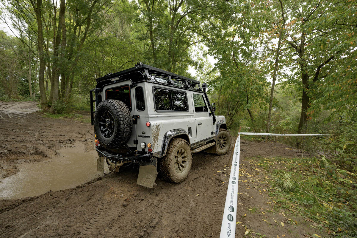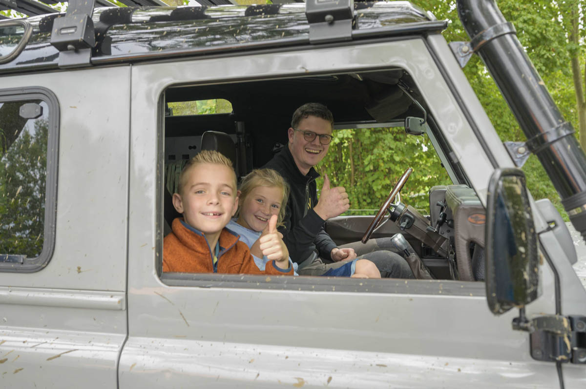 Bezoekers die het nog wat te gortig vonden om met hun eigen auto het terrein in te gaan, konden alvast een proefduik nemen. Twee Land Rover Defenders van Omnivents stonden klaar om gasten mee te nemen in een rondje door het offroadterrein.